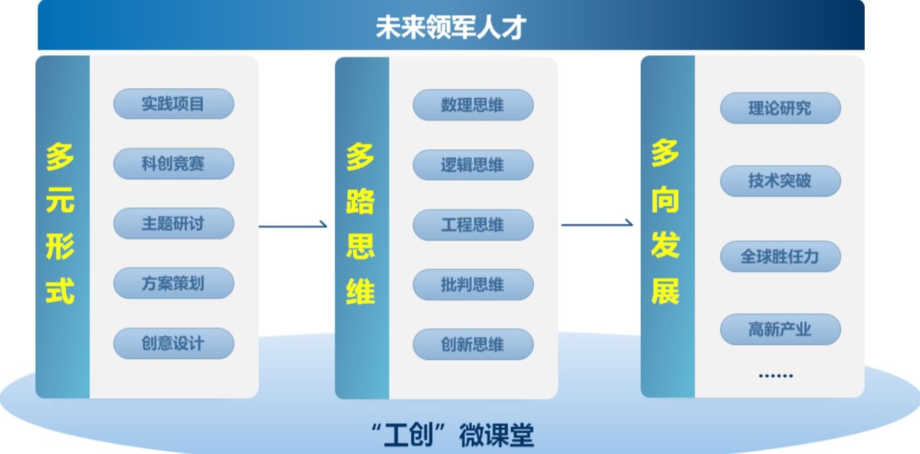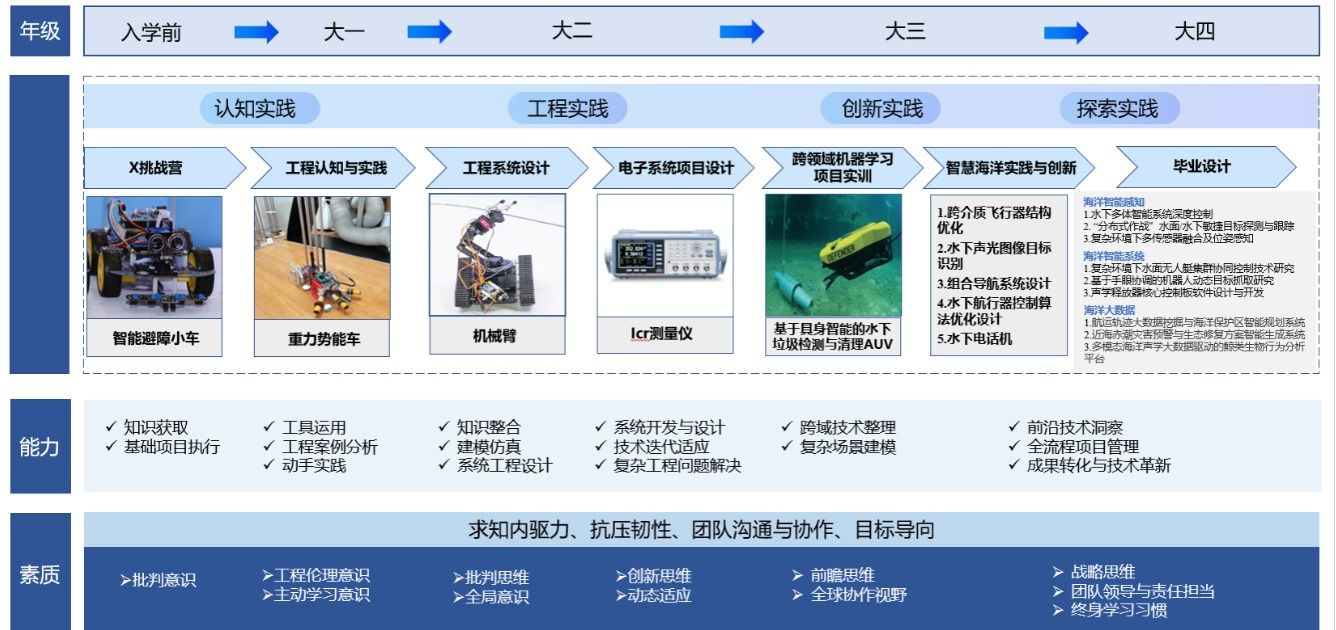 未来技术公司以智慧海洋科技项目为实践载体,构建 “兴趣激发—基础夯实—学科交叉 —前沿突破” 四阶递进培养架构,打造 “全贯通、立体化” 项目制课程体系。体系下设认知实践、工程实践、创新实践、探索实践4个模块,覆盖大一至大四全学段,形成 “能力—素质双维耦合” 的新工科人才培养范式,实现从知识建构到科研攻关的全链条培养闭环。