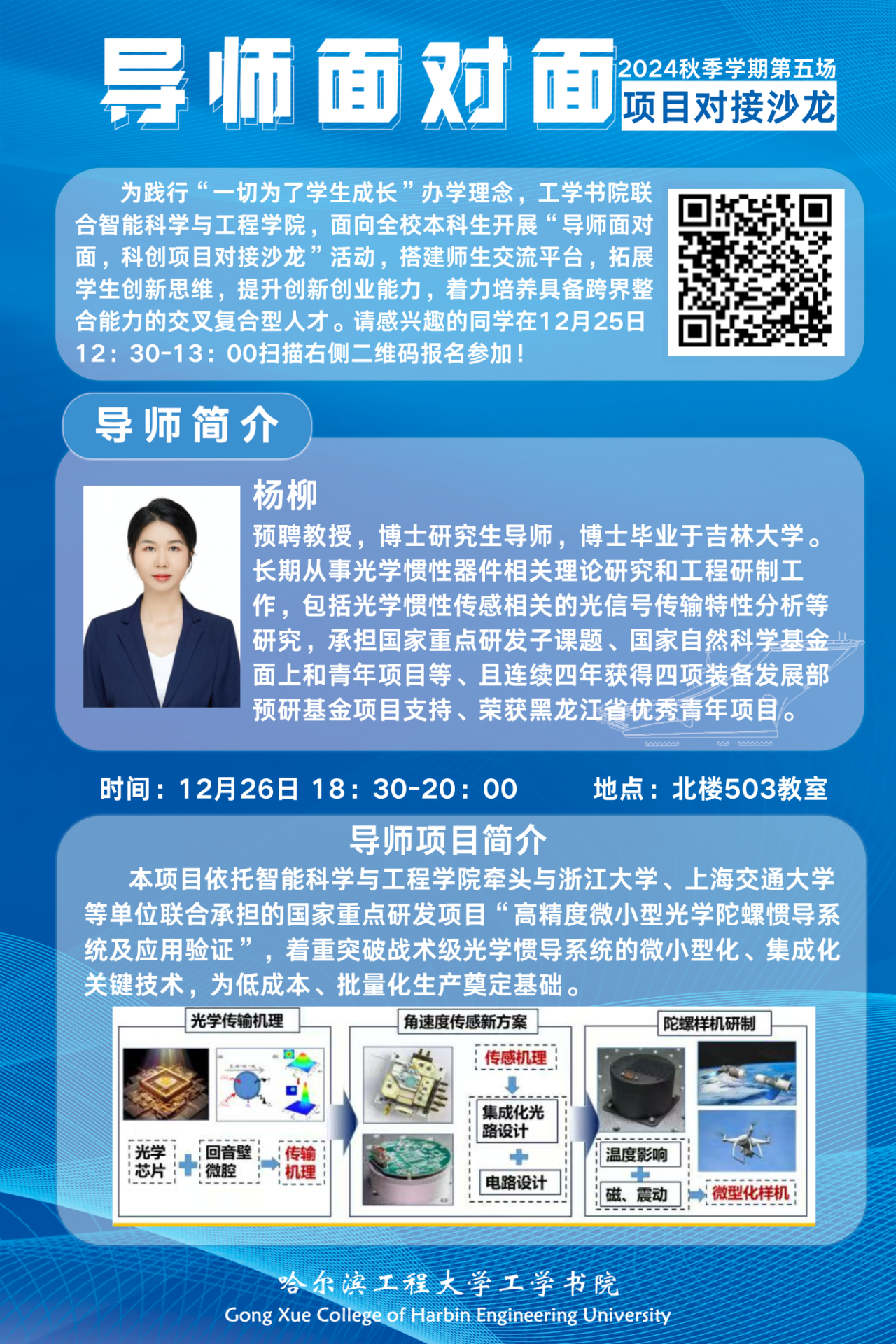 杨柳,预聘教授,博士研究生导师,博士毕业于吉林大学。长期从事光学惯性器件相关理论研究和工程研制工作,包括光学惯性传感相关的光信号传输特性分析和微弱信号检测信号检测等研究,承担国家重点研发子课题、国家自然科学基金面上和青年项目、航空基金项目等、且连续四年获得四项装备发展部预研基金项目支持、荣获黑龙江省优秀青年项目。在Physical Review Letter,Optica,IEEE TIM等国际顶级学术期刊上发表科研论文30余篇。担任中国惯性技术学报青年编委、Frontiers in Physics期刊客座编辑、Photonics期刊客座编辑,黑龙江省仪器仪表学会理事,Physical Review A,OpticsExpress等国际期刊审稿人。