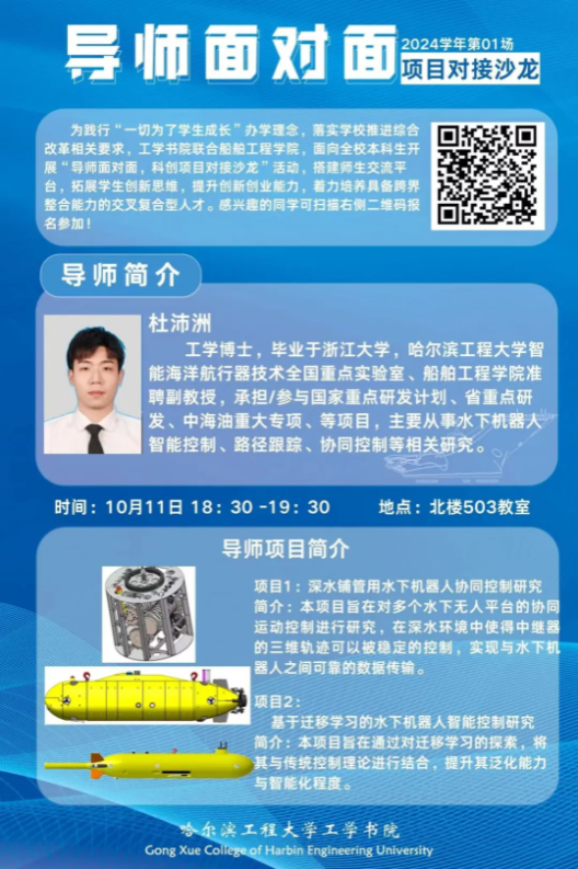 杜沛洲,工学博士,毕业于浙江大学,乐天使fun88官方网站智能海洋航行器技术全国重点实验室、船舶工程公司准聘副教授,承担/参与国家重点研发计划、省重点研发、中海油重大专项、国家海洋局重大横向、全国重点实验室稳定支持等项目,主要从事水下机器人智能控制、路径跟踪、协同控制等相关研究。