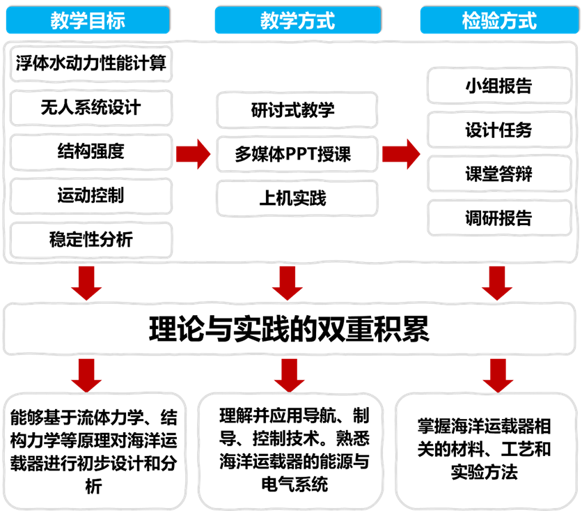 该课程研讨式教学、多媒体PPT授课、上机实践等多种教学方式多种教学模式相融合。涵盖了海洋运载器整体框架、关键技术与材料、流体力学应用、能源电气系统筹领域的基础知识和先进技术。