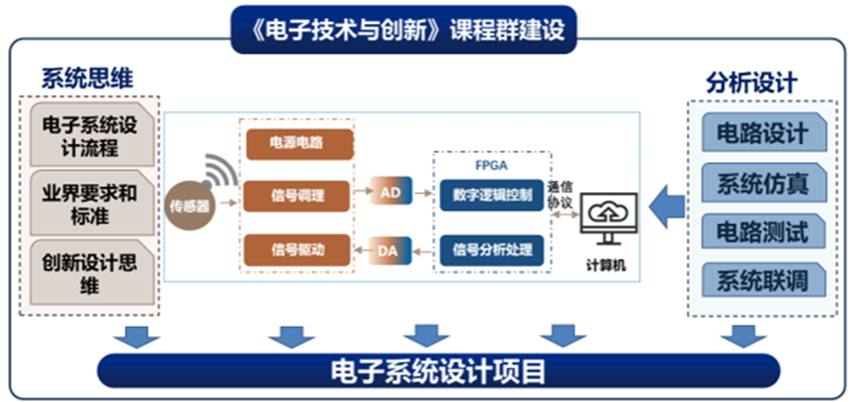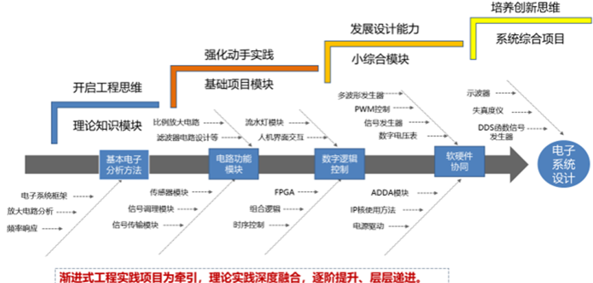 本课程根据时代的需求,探索经典的模拟电子技术、数字电子技术等路类课程和信号与系统、数字信号处理等信号处理类课程的内在联系,从信号流途径分析系统设计观念,重构课程体系,跨界融合。以渐进式工程实践项目为牵引,逐阶提升,打造了 “教学内容层层递进,能力培养持续进阶”的教学体系。通过在真实的工程环境中完成电子系统设计,在实践过程中引导员工构建整个电子信息知识体系,强调了在电子技术学习中理论知识与实际工程需求的紧密结合,旨在提升员工的实践意识和工程设计理念,以培养员工的系统思维能力和解决实际问题的能力。课程评估涵盖了开放式综合性试卷、过程性学习文档、项目研讨与实践以及项目答辩四个部分,全面考核员工的知识掌握与能力提升。
