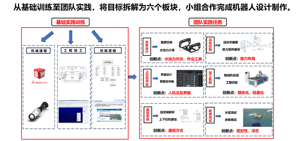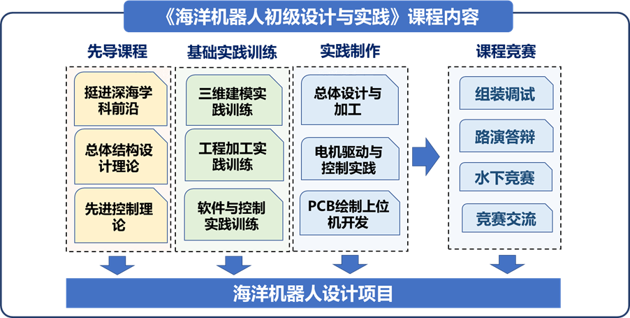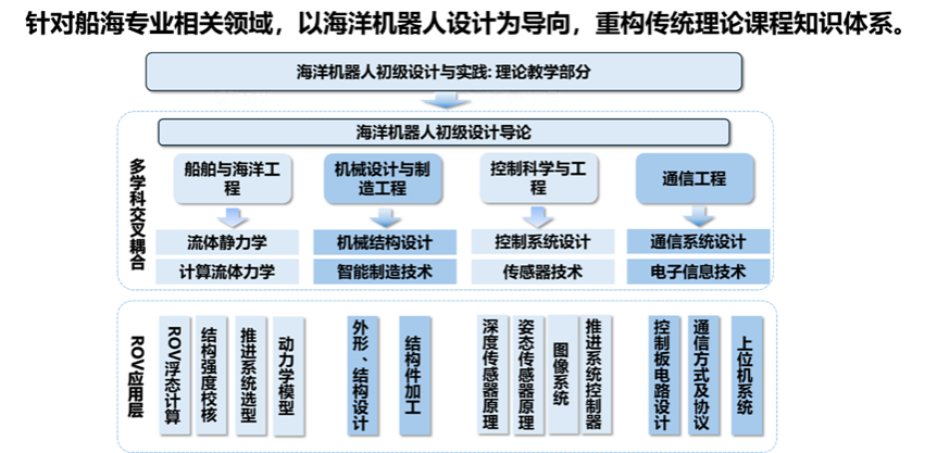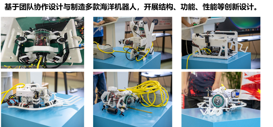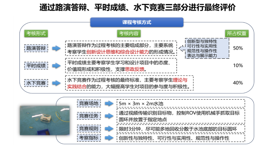 本课程分为先导课程、基础实践训练、实践制作以及课程竞赛四个部分,主要针对船舶与海洋工程专业相关领域,以海洋机器人设计为导向,重构传统理论课程知识体系。员工在老师的带领下从基础实践训练过渡到团队实践任务,开展引导式创新实践,将设计目标拆解为六个板块,通过小组合作形式完成机器人设计制作。运用趣味评价机制助推创新实践发展,全面评估员工的表达能力、创新能力、作品的可行性与实用性,形成以老师指导,研究生参与,本科生参加的形式,打通知识壁垒,增进知识层级的交流与合作。采用以赛代考的考核机制,通过路演答辩、平时成绩、水下竞赛三部分进行最终评价。通过创新实验室沉浸师生互动式的海洋机器人研发训练,培养了员工应用海洋工程、机械、电子控制、材料等知识解决海洋智能工程问题的综合实践和创新能力。