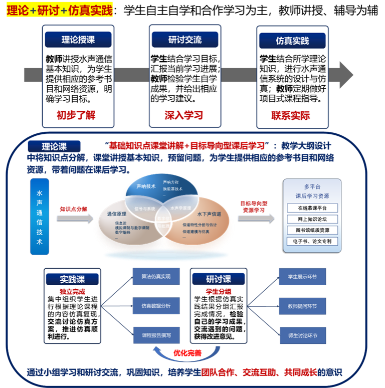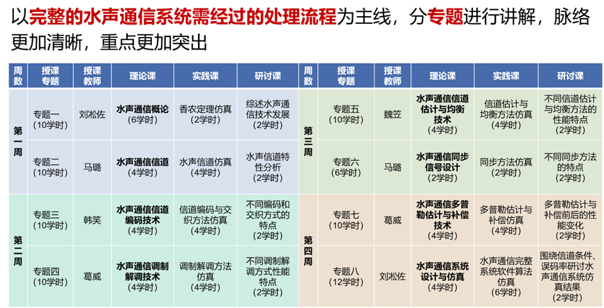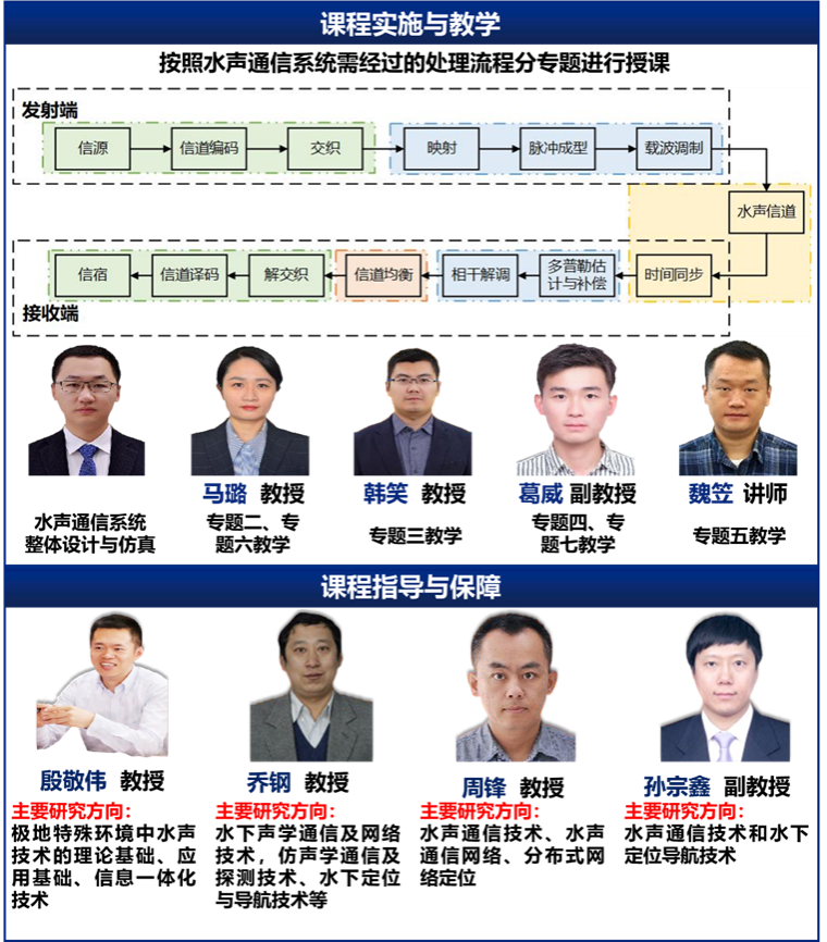 本课程旨在使员工系统掌握水声通信技术的基础理论与方法,明晰其发展脉络与技术体系,熟练运用相关工具软件完成水声通信系统设计;通过小组协作任务强化团队沟通与表达能力,依托设计实践推动跨学科知识整合,最终实现终身学习能力、综合实践能力及创新思维的系统化培养。